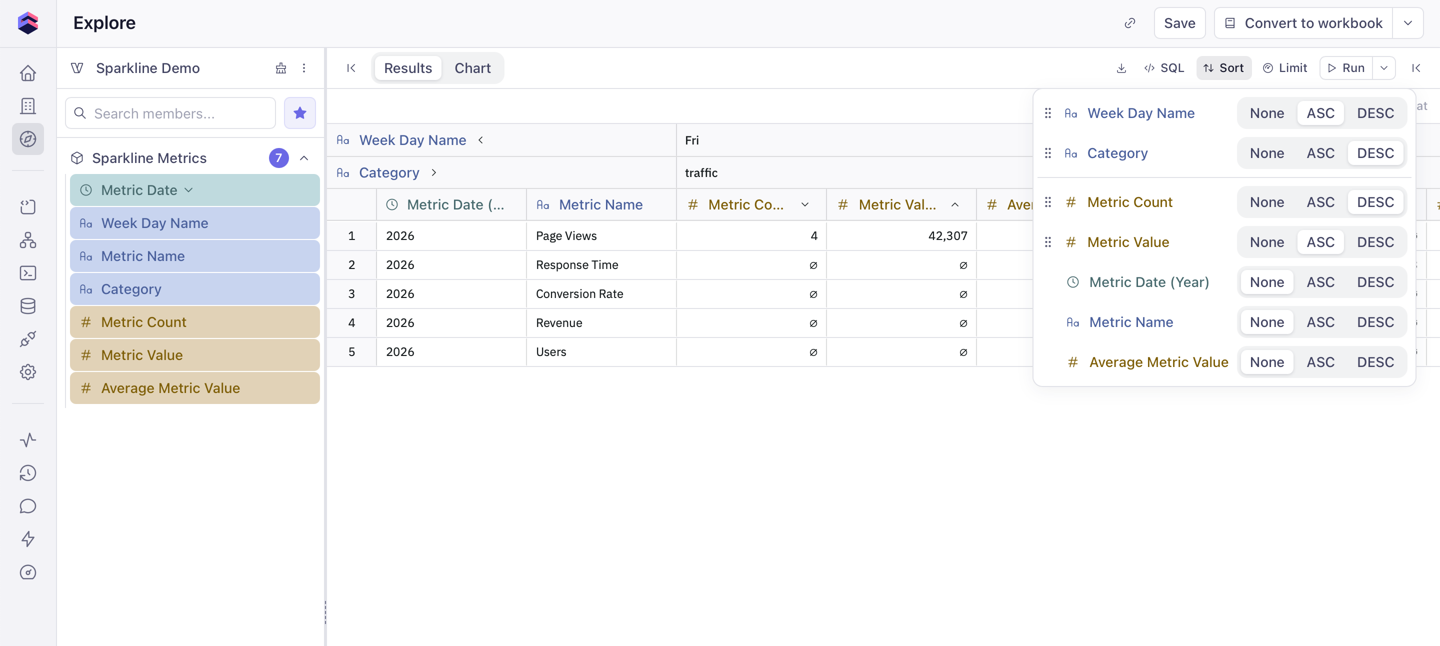 The sorting control, available via the Sort button, lists all query members and their current state: unsorted, sorted ascending, or sorted descending. Use it to apply or change the sort order for any member. Drag and drop members within the sorting control to change their priority in the sort order.Advanced semantic queries