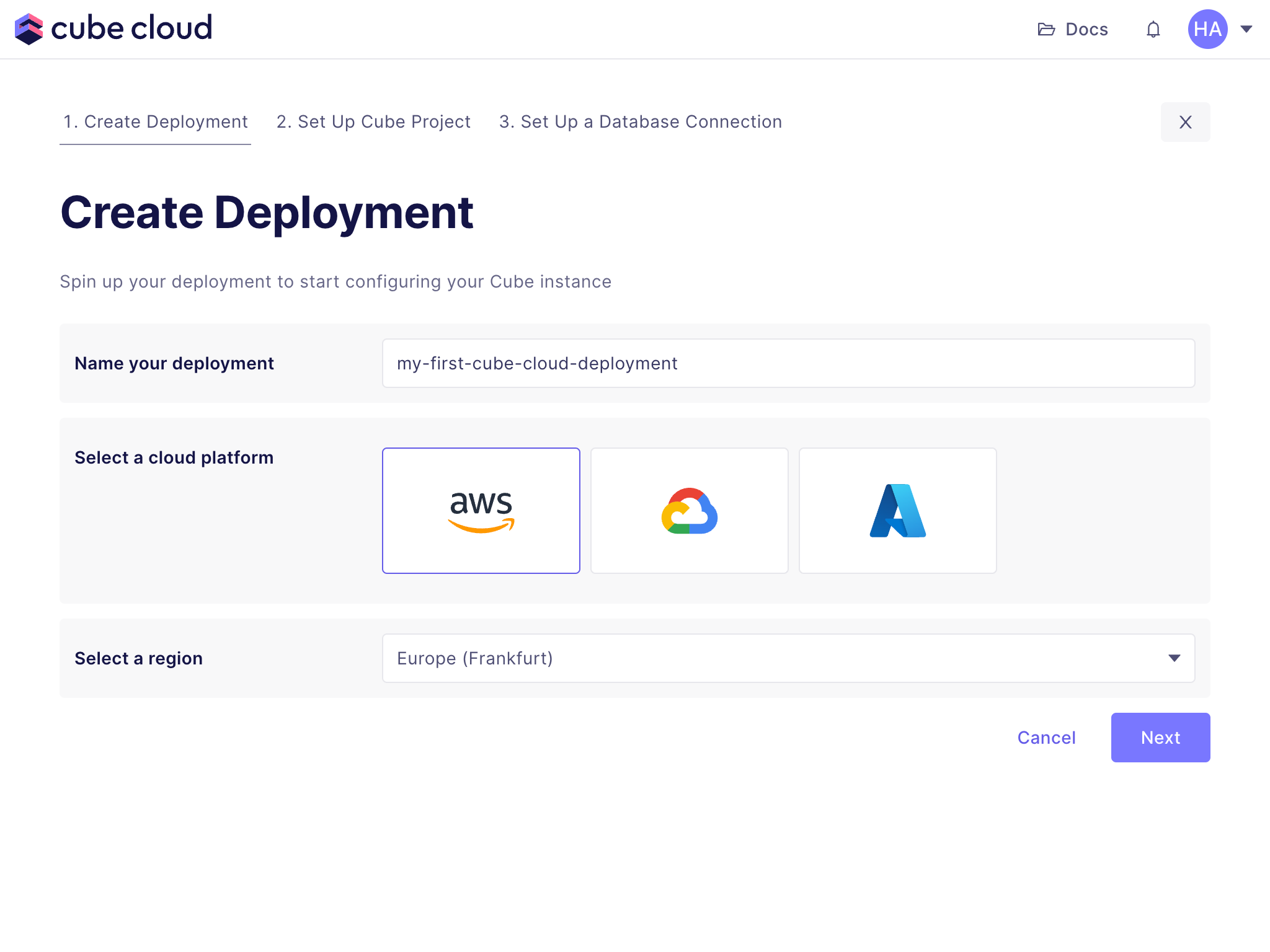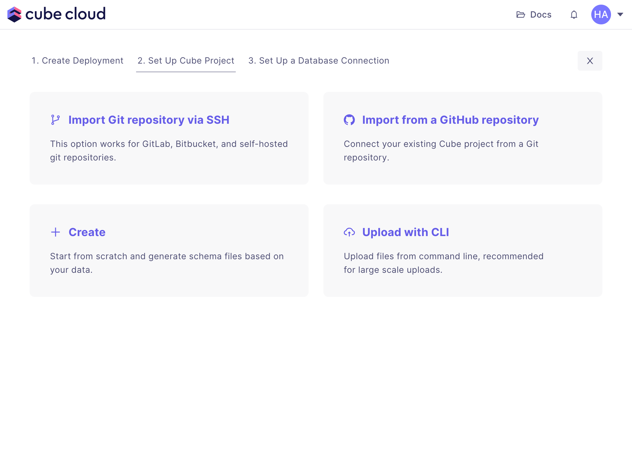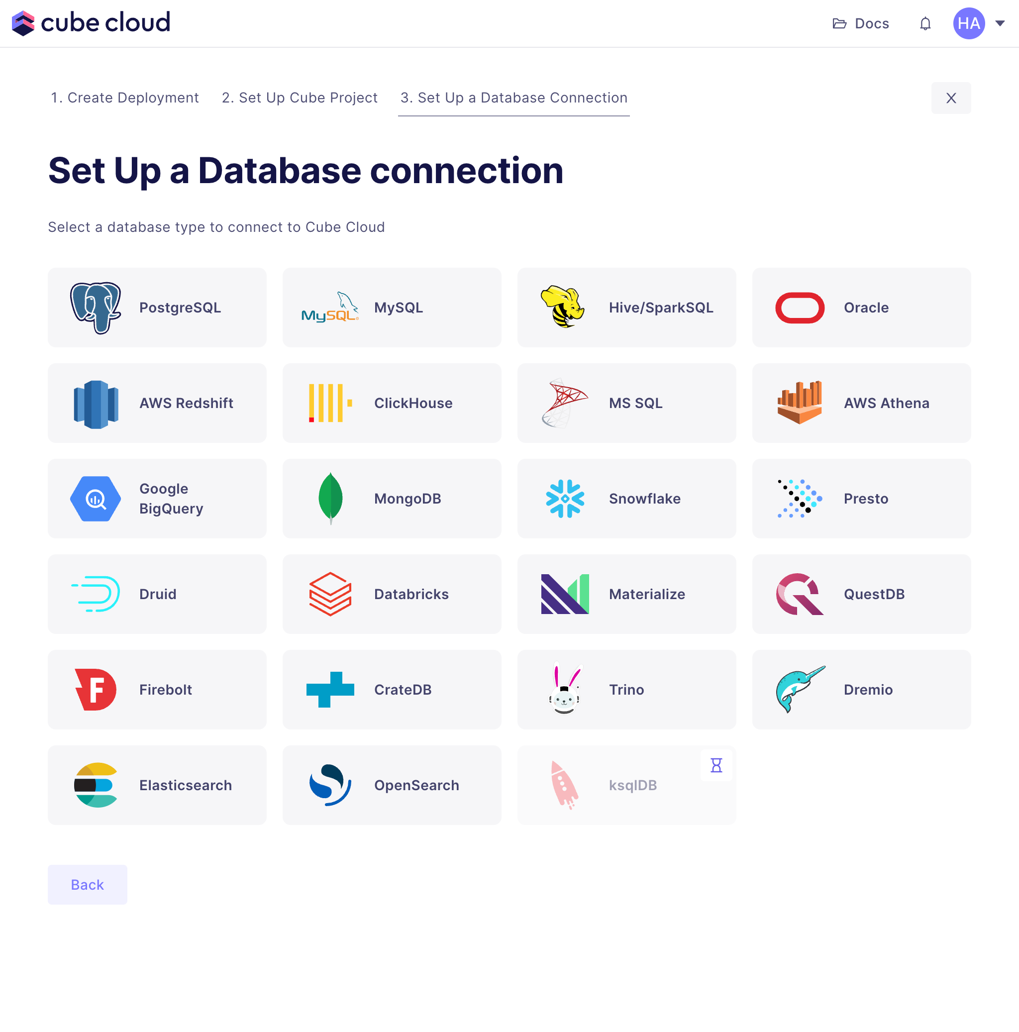 The last step is to connect Cube Cloud to Databricks. First, select it from the grid:- Access Token: A personal access token for your Databricks account. You can generate one in your Databricks account settings.
